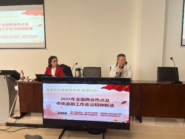 新办公区大会议室,为全体教职工作题为《2024年两会热点及中央金融工作会议精神解读》专题辅导。专题辅导会由AG真人视讯