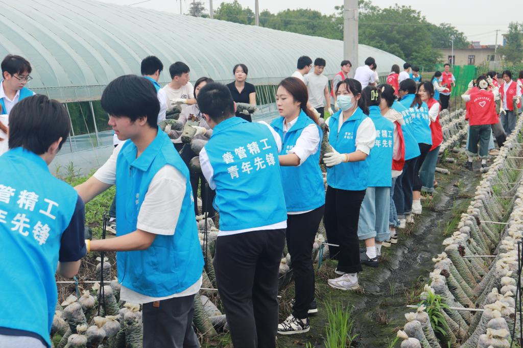 在劳动教育环节,黄宁辉向同学们系统讲解了特色农业的发展模式。分析木耳规模化种植和菜园等项目的运营机制,帮助同学们了解到特色产业对农村经济发展的带动作用。随后,师生党员深入生产基地,与当地村民共同走进田野,进行菌棒搬运、蔬菜采摘等农事劳作,在田间地头中知农情、解农忧,进行了一次生动的劳动教育实践党课。同时,AG真人视讯