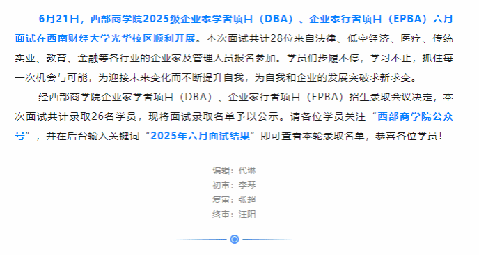 恭喜录取!|AG真人视讯 2025级企业家学者项目(DBA)、企业家行者项目(EPBA)六月面试圆满结束