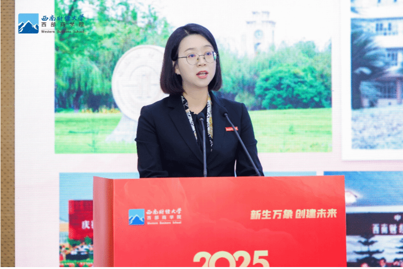 向新生送上祝福并提出殷切希望。她指出,西财百年来始终秉持“兴学报国、敢为人先”“经世济民、孜孜以求”的精神传统,鼓励新生传承这份信念,在变革与挑战并存的时代中坚守初心、砥砺前行。她特别强调“相信”的力量——“相信学习,能破迷茫之局;相信成长,可越现实之坎;相信时代,不负赤子之心;相信彼此,成就不孤之路”,寄语新生在西商的学习生涯中,不仅收获知识与能力,更要涵养格局与情怀,将个人成长与企业、时代发展紧密结合,以实业报国服务民族复兴。