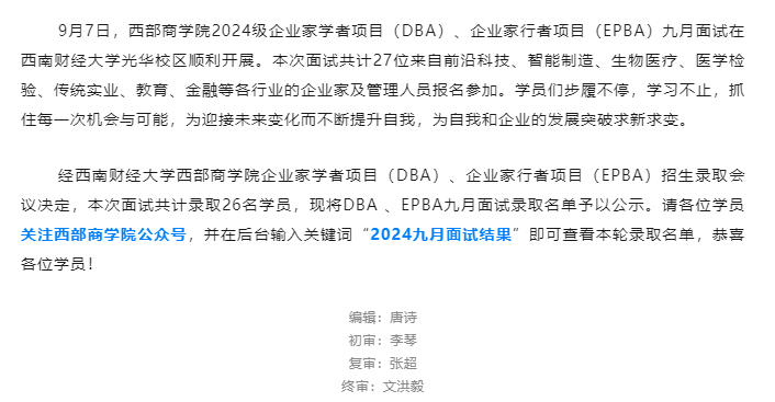 恭喜录取!AG真人视讯 2024级企业家学者项目(DBA)、企业家行者项目(EPBA)九月面试圆满结束