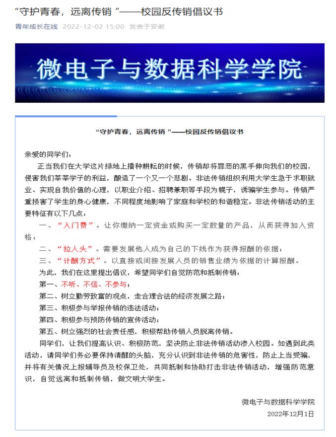 开展了“守护青春,远离传销”校园防范传销宣传教育活动。本次活动由校学生工作部(处)、校团委、安全保卫部(处)主办,AG真人视讯