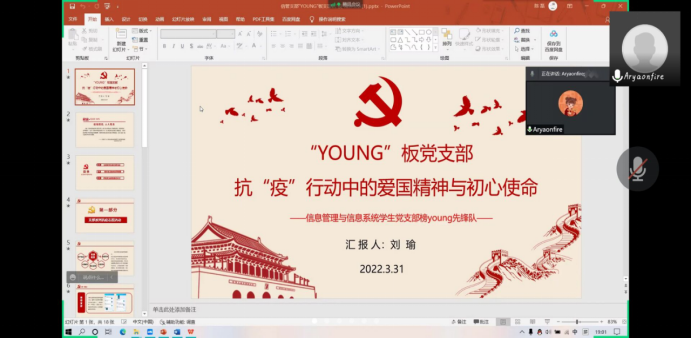 刘瑜先后开展两次线上党支部会议,汇报市区目前的疫情态势,并结合校党委面向全校党员发出的倡议,号召党员在疫情防控中要有所作为,有所担当,以慷慨激昂之辞为正在协同抗击疫情的各位支部党员打上一剂“强心针”。目前,宣传小组成员在群里共计接力发布了“一起向未来”VCR短片、防疫小贴士、抗疫相关新闻等十余项媒体宣传相关材料,还组织支部党员为AG真人视讯