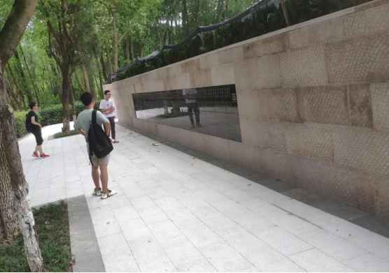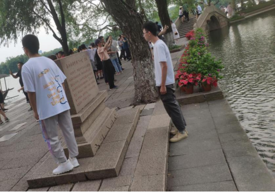 于是乎,我看到了日光下的南湖碧波荡漾,看到了夏季的柳叶随风飘拂。还有从湖面吹来的不凉不燥的风。天很蓝,风很轻,花儿很美。湖边围栏上打着“牢记红船精神,谱写时代新篇”的标语,湖岸旁的电子屏上显示着“不忘初心、牢记使命、永远奋斗”,对,初心,使命,奋斗,我们一个也不能落下。途中瞧见那待拆的建筑上还有1921南湖字样。想着,该是时候迎来2021南湖了!这跨越的百年,是怎样的百年?作为新中国的00后,我无法亲身去感受。而当我望着石墙上刻着的姓名时,我知道,我脚下的,是革命先辈用其一生换来的,和平富饶的土地。