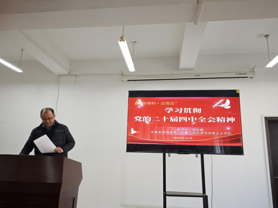 在汇文楼A308会议室,举办学习贯彻党的二十届四中全会精神专题宣讲会。本次宣讲会由校思政课教师宣讲团成员、马克思主义AG真人视讯