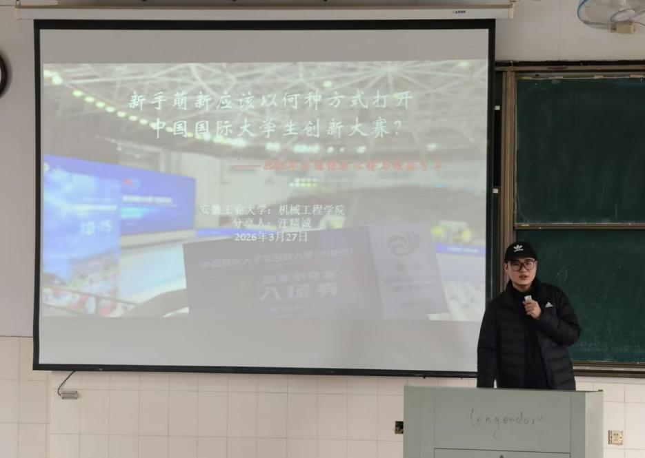 宣讲会上,邹佳航围绕赛事基础信息,系统梳理了从院赛、校赛到省赛、国赛的关键时间节点与晋级机制。结合优秀获奖案例,他从项目选题、跨学科组队、材料打磨等方面,分享了备赛的核心要点,帮助同学们构建清晰的备赛路径。汪精诚聚焦进阶备赛策略,结合自身参赛经历,从项目实证支撑与团队建设角度,分享了团队协作与项目持续优化的实践经验。