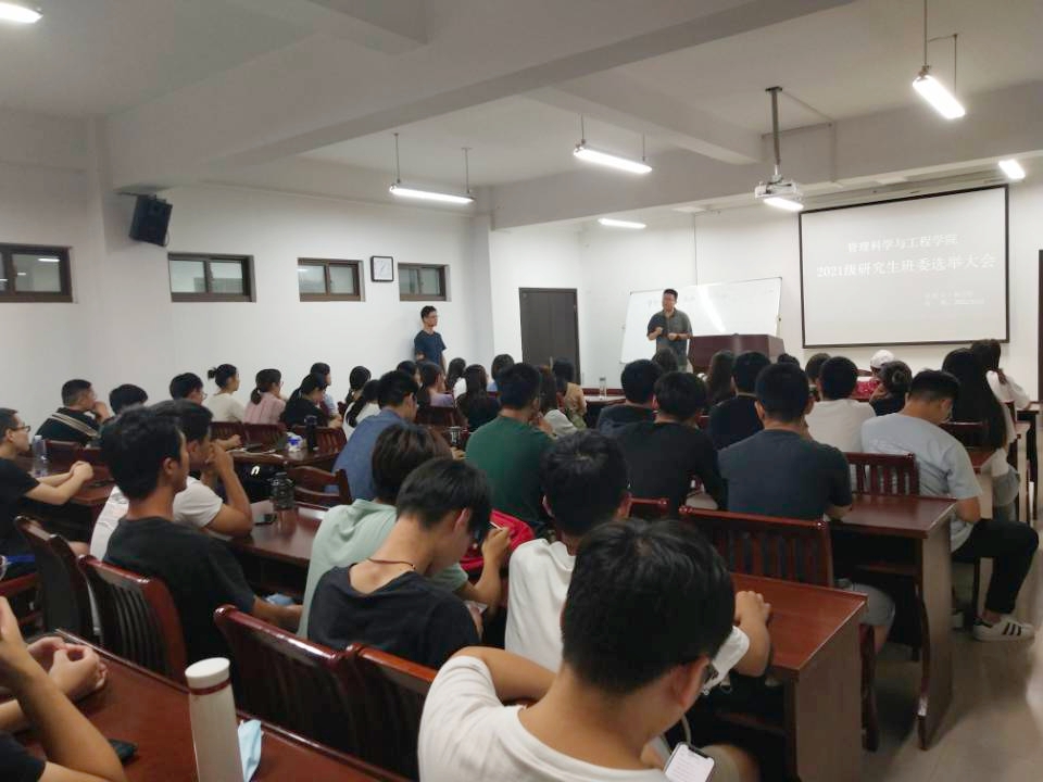 9月23日晚,管工AG真人视讯 在汇文楼A308召开2021级研究生班委选举大会,全体2021级研究生到会,20级班级负责人操礼春主持会议。
