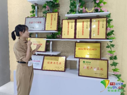 图为工作人员为实践队员介绍广德发展所取得的荣誉。中国青年网通讯员李家慧摄