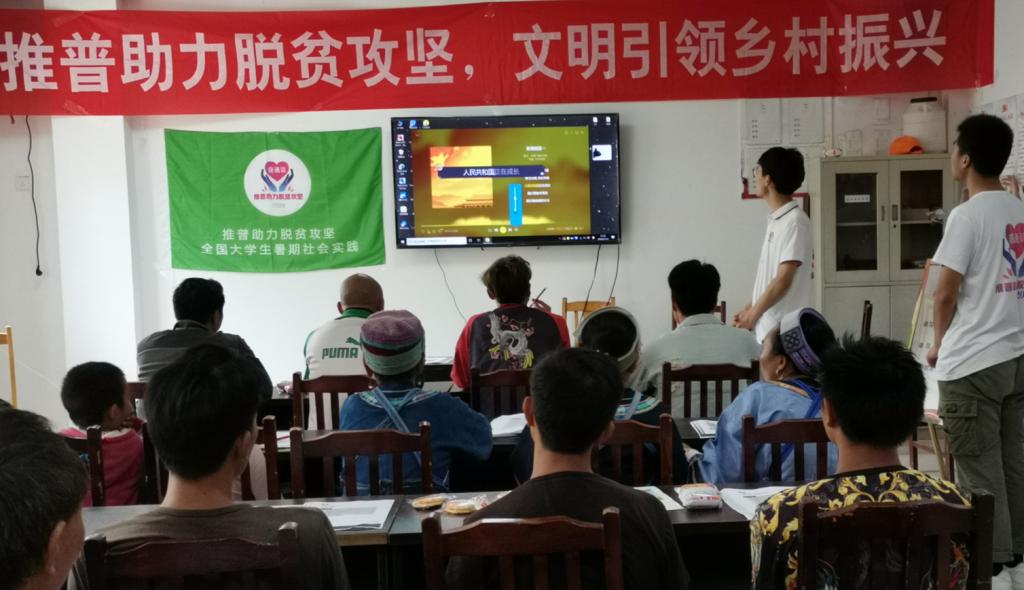 实践队员们为前来学习的村民们准备了铅笔、本子与教学课件等,耐心等待着村民们前来。身穿苗族传统服饰,背着娃娃的妇女,正计划去外地务工的苗族小伙,从未上过学只会讲苗语的大妈…..大家齐聚一堂,认真听着志愿者们的讲课。村民罗大哥向志愿者介绍,他家里有3个儿子1个女儿,现在都在广东打工,只有过年的时候才会回来。介绍过程中,40多岁的罗大哥表示自己只上过小学,上学时候老师主要用苗语上课,现在才开始学普通话,自己也很想学习普通话。