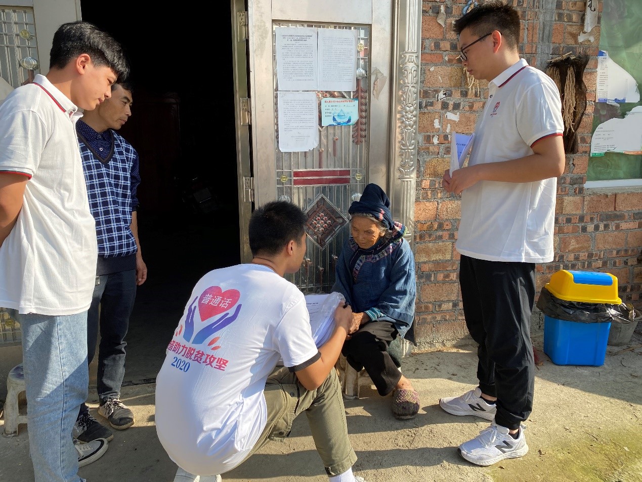 下午到达目的地后,稍作调整,实践队员便在四大寨乡乡政府工作人员、当地志愿者的引导下,对关口村村民进行了走访调研。调查对象主要为当地18-45岁贫困青壮年劳动力普通话的使用情况以及使用过程中的困难。实践队员们了解到关口村共有343户人家,少数民族人口占全村总人口的99%,以苗语为主要交流语言,大部分的青壮年村民都不会说普通话。