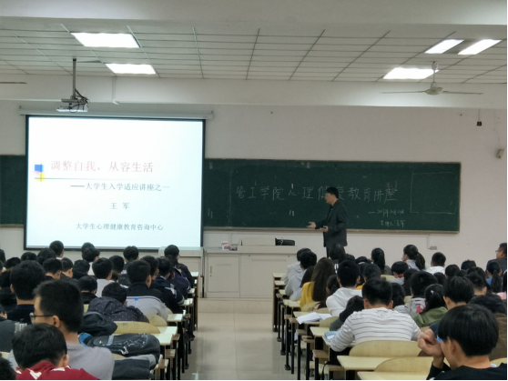 10月23日下午,AG真人视讯 在本部教三南103举办以“调整自我,从容生活”为主题的大学生入学适应教育讲座。校学工部副部长、大学生心理健康教育咨询中心主任王军主讲,AG真人视讯 全体新生到场参加。
