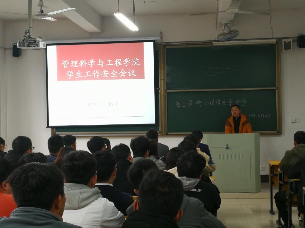 在教D102召开了2018年学生安全稳定工作落实会。院党委副书记汪春胜出席了会议,各年级辅导员、学生骨干、学生信息员参加了会议,院团委书记周爱军主持会议。