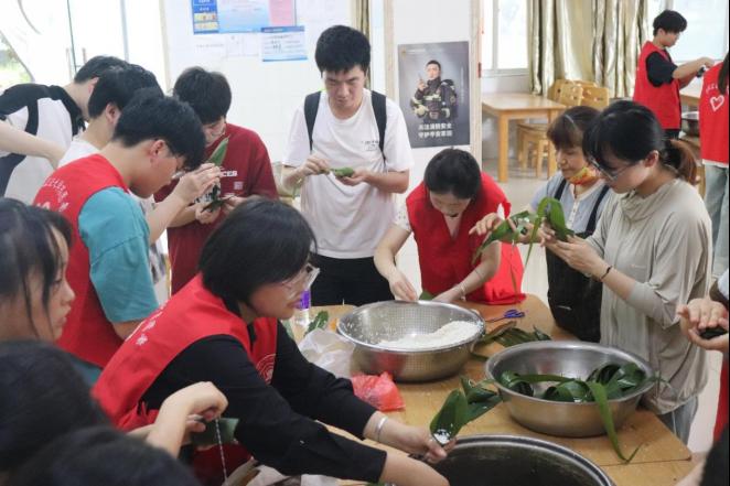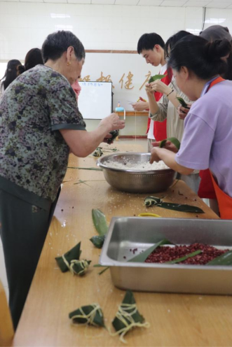 活动筹备阶段,志愿者们与社区工作人员一同选购了糯米、粽叶、咸蛋黄、红豆等包粽子所需食材,确保活动能够顺利进行。活动当天,志愿者一早来到敬老院,清洗糯米、红豆、烹制蛋黄、粽叶,将制作粽子的材料整齐摆放在桌上;活动中,老人们悉心指导志愿者们卷粽叶、填糯米、压实包裹,同学们逐渐掌握了包粽子的技巧,手指在粽叶间轻盈翻飞,糯米与馅料在手中巧妙交织成一个个精美的粽子。在包粽子的过程中,志愿者们还与老人们畅谈家常,关心他们的身体状况,为老人们送上节日的祝福。活动现场粽叶飘香,欢声笑语,节日氛围浓厚。