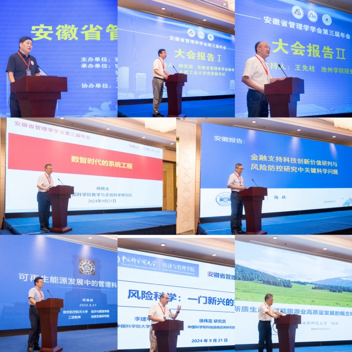 大学李建平教授,安徽师范大学原副校长陆林教授分别作了题为“数智时代的系统工程”、“金融支持科技创新价值研判与风险防控研究中的关键科学问题”、“可再生能源发展中的管理科学问题”、“风险科学:一门新兴交叉科学”、“新质生产力赋能旅游业高质量发展的概念矩阵与研究展望”的大会报告。