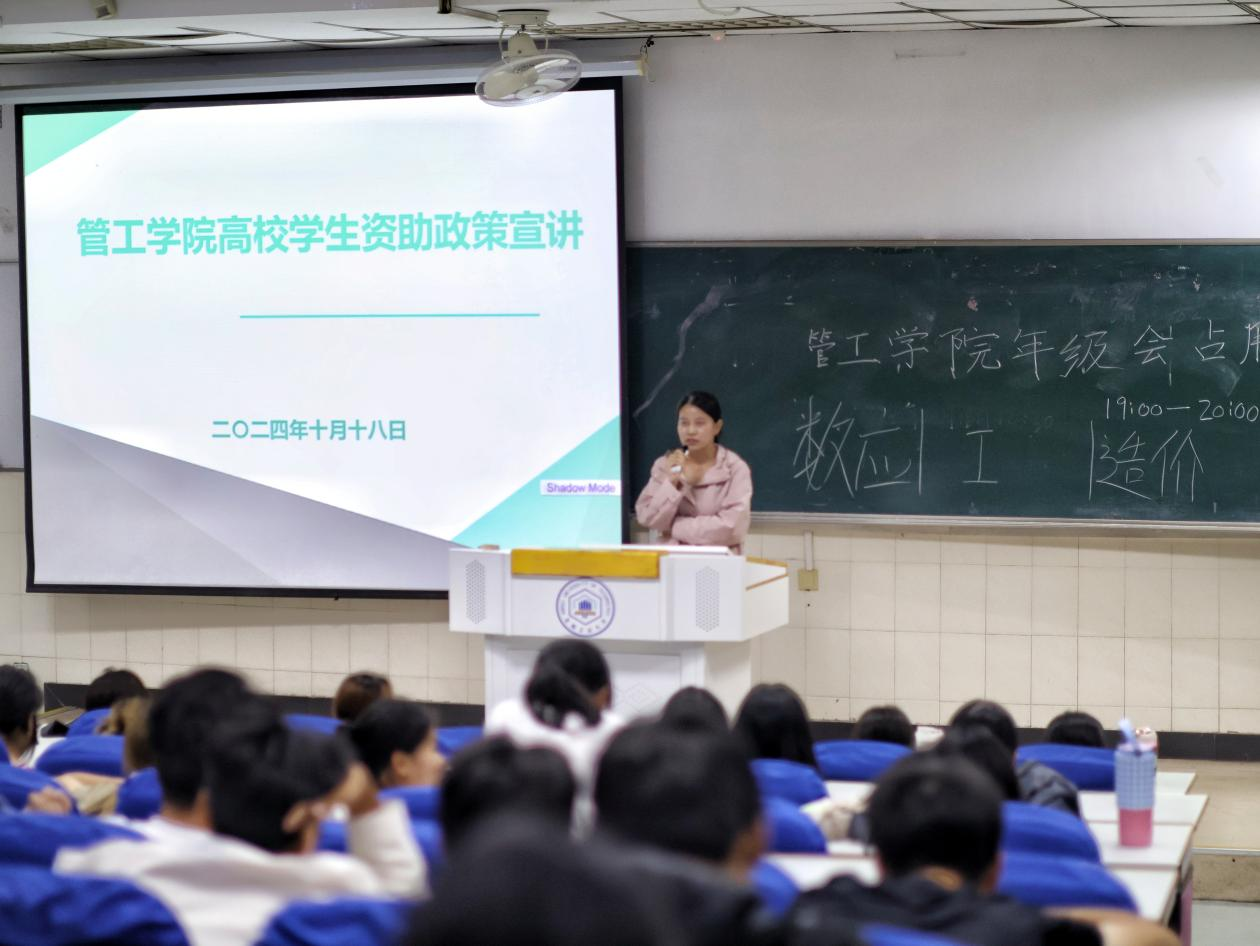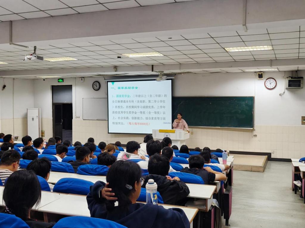 会上,李军慧首先向同学们详细介绍国家奖学金、国家励志奖学金、国家助学金、服兵役国家教育资助等各项资助政策,从资助标准、资助范围、申请条件、申请时间、发放时间等五个方面深入解读,并详细讲述了生源地信用助学贷款以及还款流程的相关注意事项。