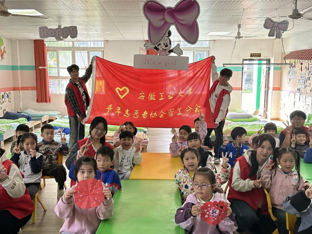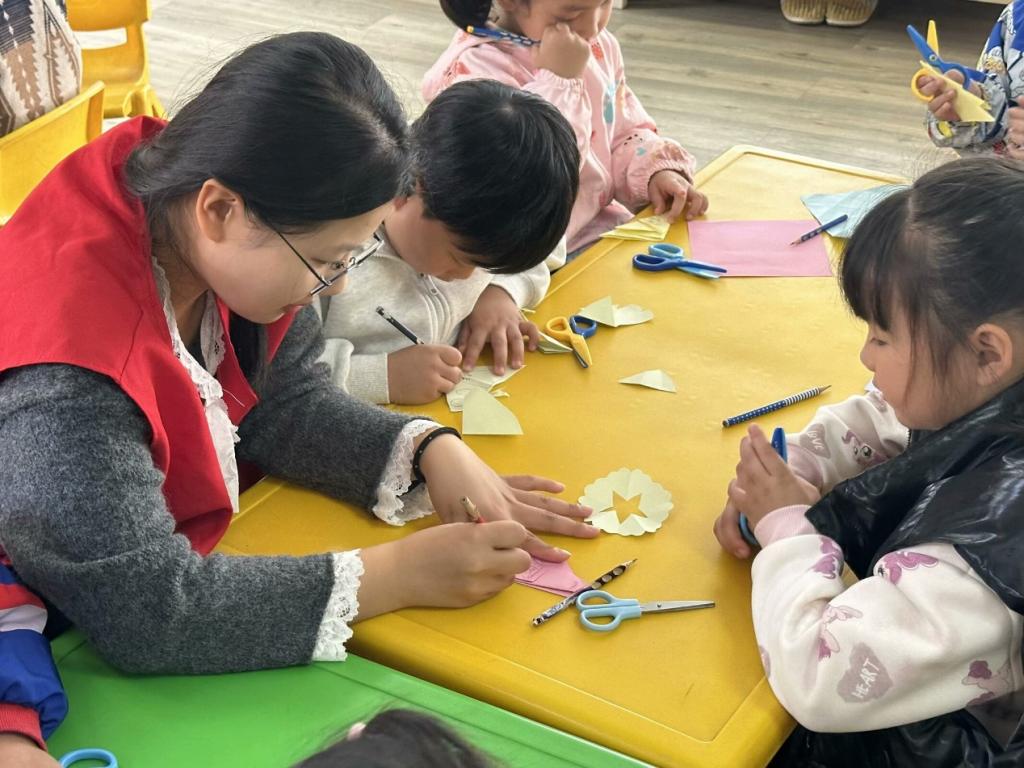 “青青星火·汇聚童心”——守护童年志愿服务队前往马鞍山市金瑞社区大风车幼儿园开展“纸间翻跃,剪出万象”剪纸美育志愿服务活动。