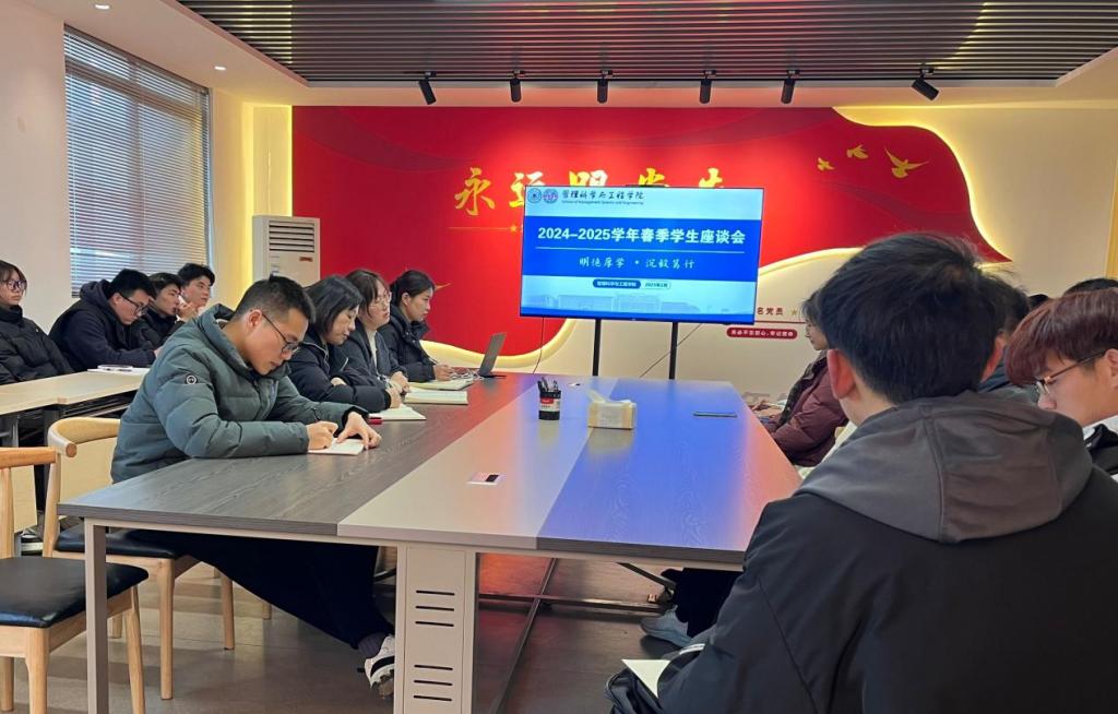 在汇文楼A502组织召开2024-2025学年春季学期学生座谈会。院党委副书记、纪委书记、副院长赵颖,2022级辅导员赵玉婷,2023级辅导员曹宇,2024级辅导员李军慧出席会议,AG真人视讯