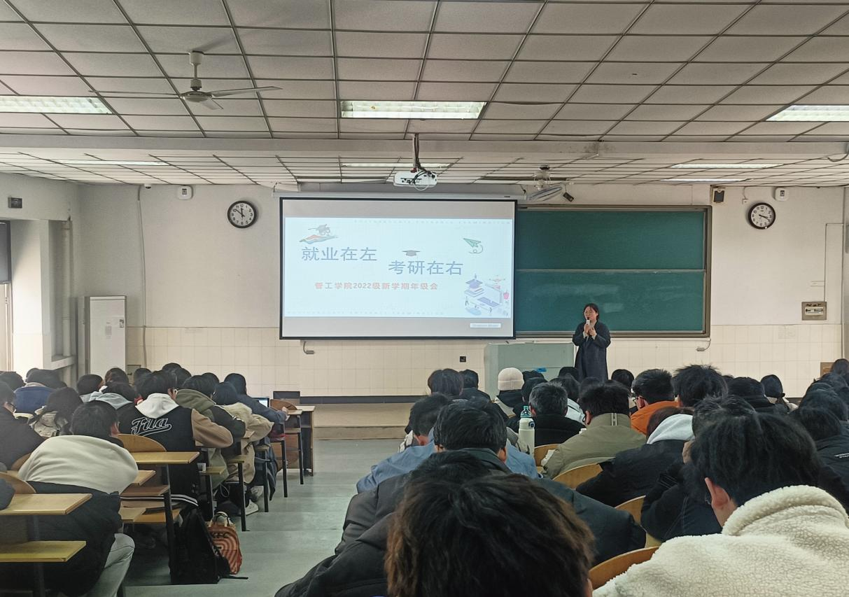 2022级在秀山校区阶教202、203分专业召开“就业在左,考研在右”为主题的新学期年级会。本次会议由2022级辅导员赵玉婷、焦朋庆主持。