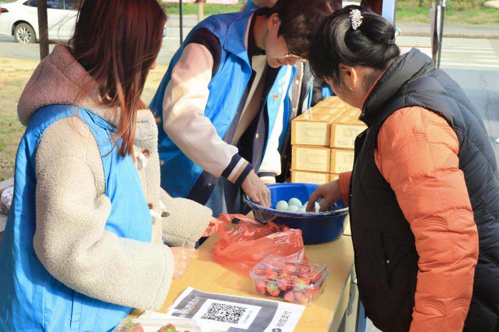 消费帮扶活动,支部学生党员化身“销售员”,与农户一同销售农产品。