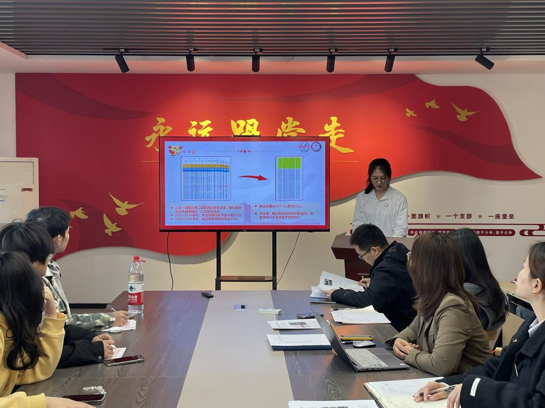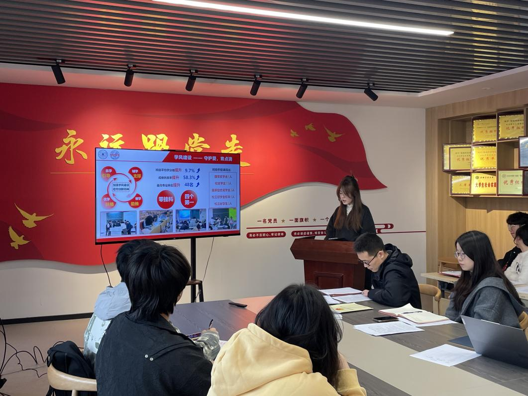 在汇文楼A502举办2025年“五四红旗团支部”答辩会。院团委书记赵玉婷、院团委副书记李军慧、院团委副书记曹宇、2024级辅导员孙如梦担任答辩评委,共12个团支部参与答辩。