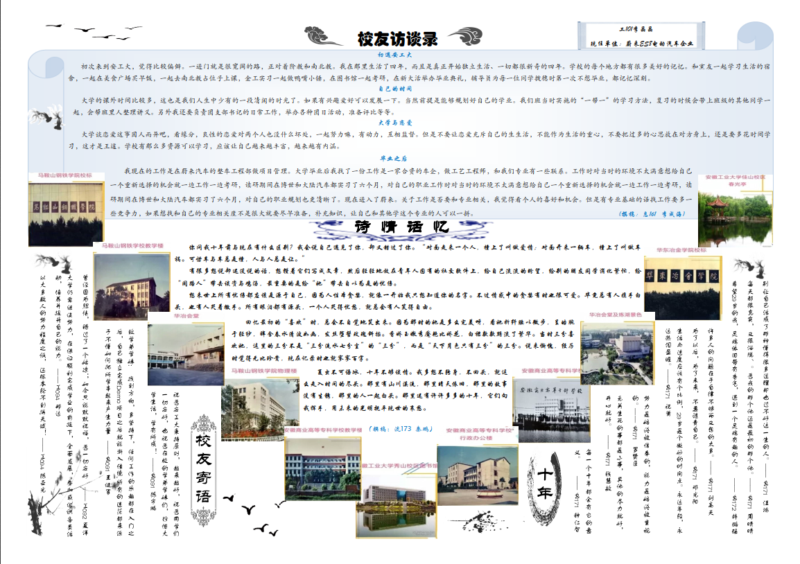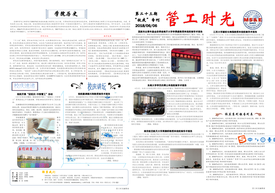 管工时光为AG真人视讯 院报宣传平台,负责AG真人视讯 传统媒体报纸的编辑、策划与排版,与月刊、半月刊的形式对AG真人视讯 近期重大活动事件进行综合报道,同时根据国家实事推出专刊。特设诗话管工环节,鼓励学生原创诗歌投稿,激发学生创作热情。以下为管工时光第二十三期第一、二版: