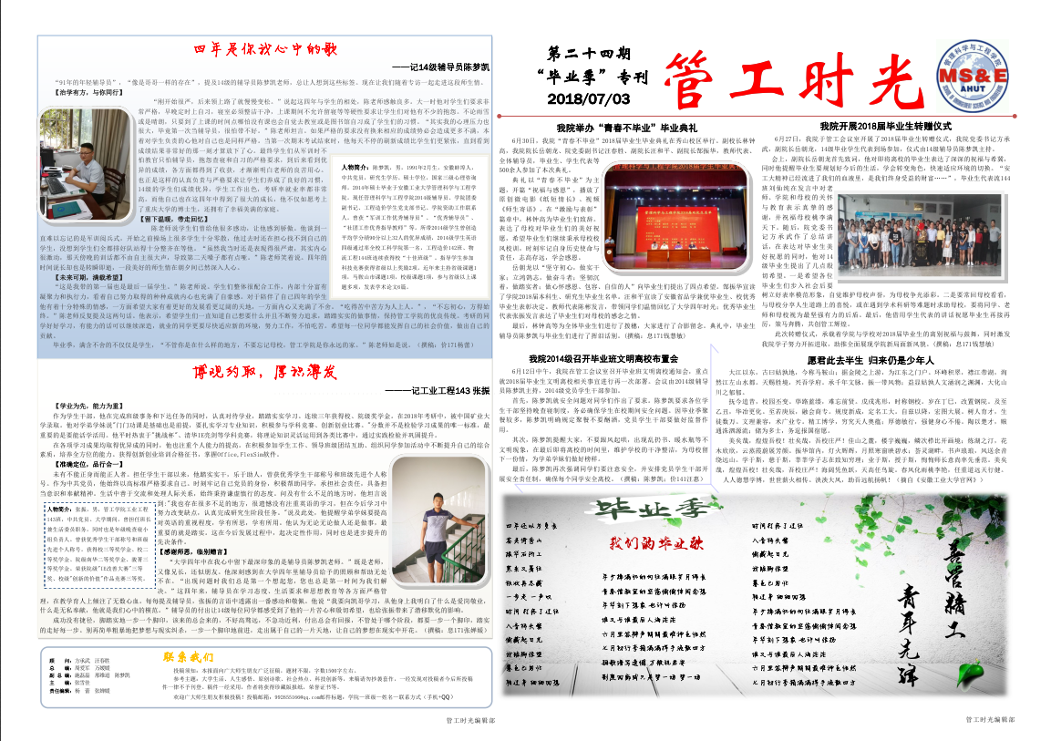管工时光为AG真人视讯 院报宣传平台,负责AG真人视讯 传统媒体报纸的编辑、策划与排版,与月刊、半月刊的形式对AG真人视讯 近期重大活动事件进行综合报道,同时根据国家实事推出专刊。特设诗话管工环节,鼓励学生原创诗歌投稿,激发学生创作热情。以下为管工时光第二十四期第一、二版: