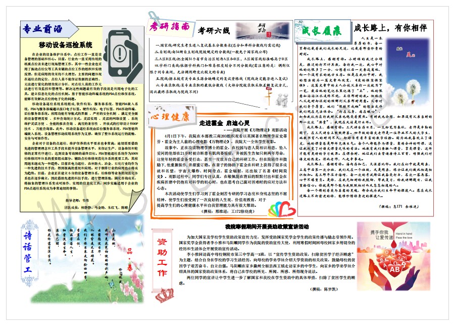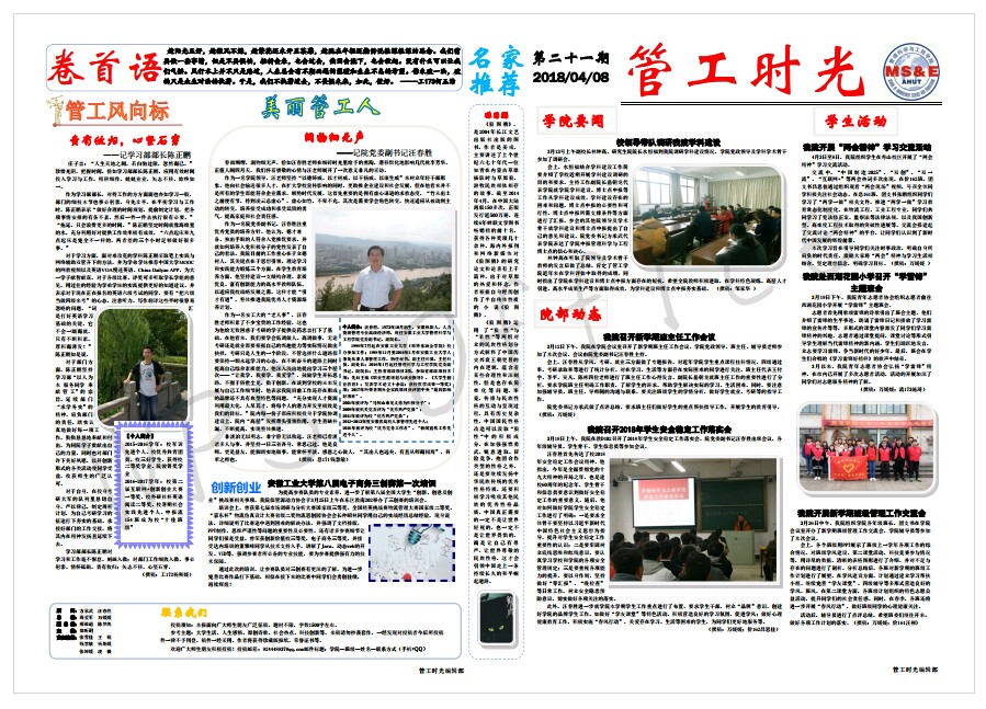 管工时光为AG真人视讯 院报宣传平台,负责AG真人视讯 传统媒体报纸的编辑、策划与排版,以月刊、半月刊的形式对AG真人视讯 近期重大活动事件进行综合报道,同时根据国家实事推出专刊。特设诗话管工环节,鼓励学生原创诗歌投稿,激发学生创作热情。以下为管工时光第二十一期第一、二版。