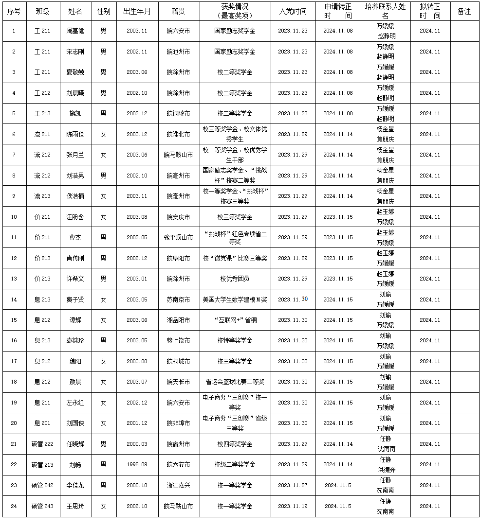 经党支部研究,拟将周基健等24位同志转为中共正式党员,现将他们的有关情况予以公示,欢迎广大党员、干部、群众通过信函、电话或直接到党支部或上级党组织反映公示对象在预备期间内的思想品质、现实表现、廉洁自律等方面情况。