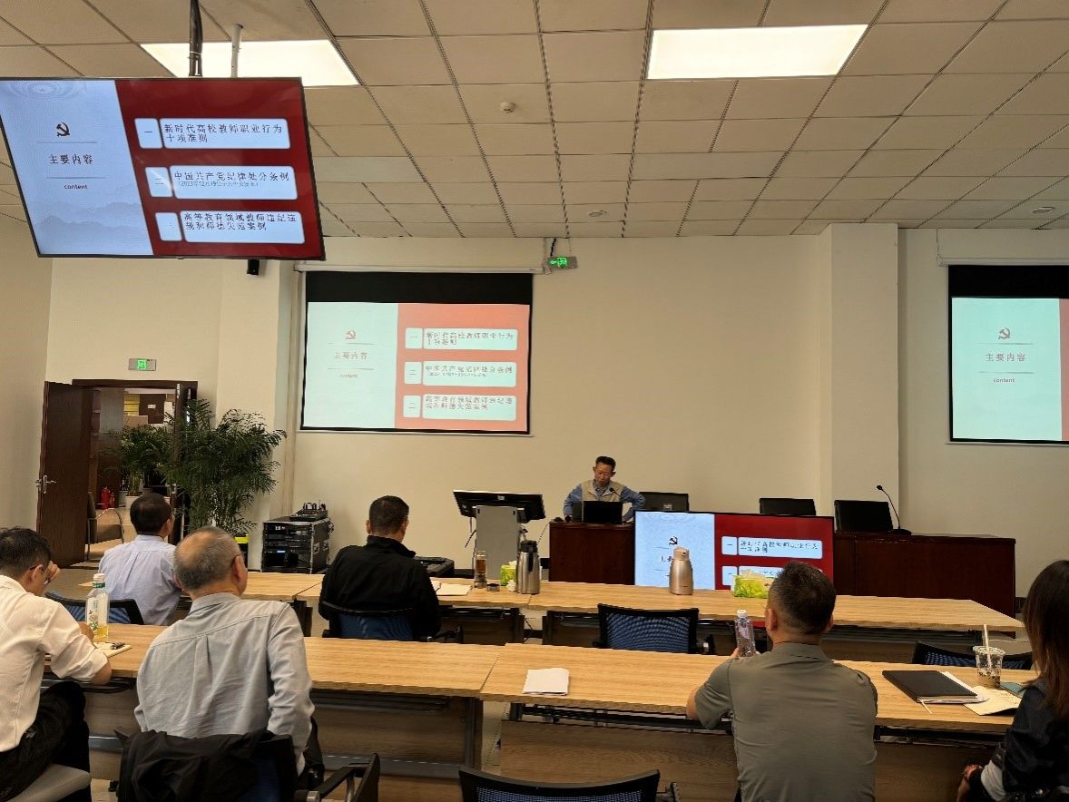 党总支关于开展党纪学习教育的工作计划向大家进行了介绍和说明。会议强调,全体党员、教职工要深学细悟习近平总书记关于党的自我革命的重要思想,更好地理解全面从严治党的深刻含义,广大党员尤其是党员领导干部要学纪明纪,增强纪律意识,严于律己、严负所责、严管所辖,守住纪律底线。文洪毅还为大家开展了师德师风专题学习暨警示教育。他首先带领大家重温了《新时代高校教师职业行为十项准则》,强调作为高校教师,要严守底线、学为人师,行为世范。随后,他为大家进行了《中国共产党纪律处分条例》(以下简称《条例》)导学,着重讲解了2023年12月8日中共中央政治局会议第三次修订的主要内容,指出党中央时隔5年再次修订《中国共产党纪律处分条例》,就是要贯彻落实党的二十大战略部署,不断完善纪律规矩,始终坚持严的基调,释放从严治党越来越严、越往后执纪越严的强烈信号。最后,他结合《高等教育领域教师违纪违规和师德失范案例(2024年第1期 总第18期)》整理的案例为大家进行了典型案例警示教育,再次提醒大家严格遵守高校教师职业行为“红线”,强调以案为鉴、警钟长鸣。